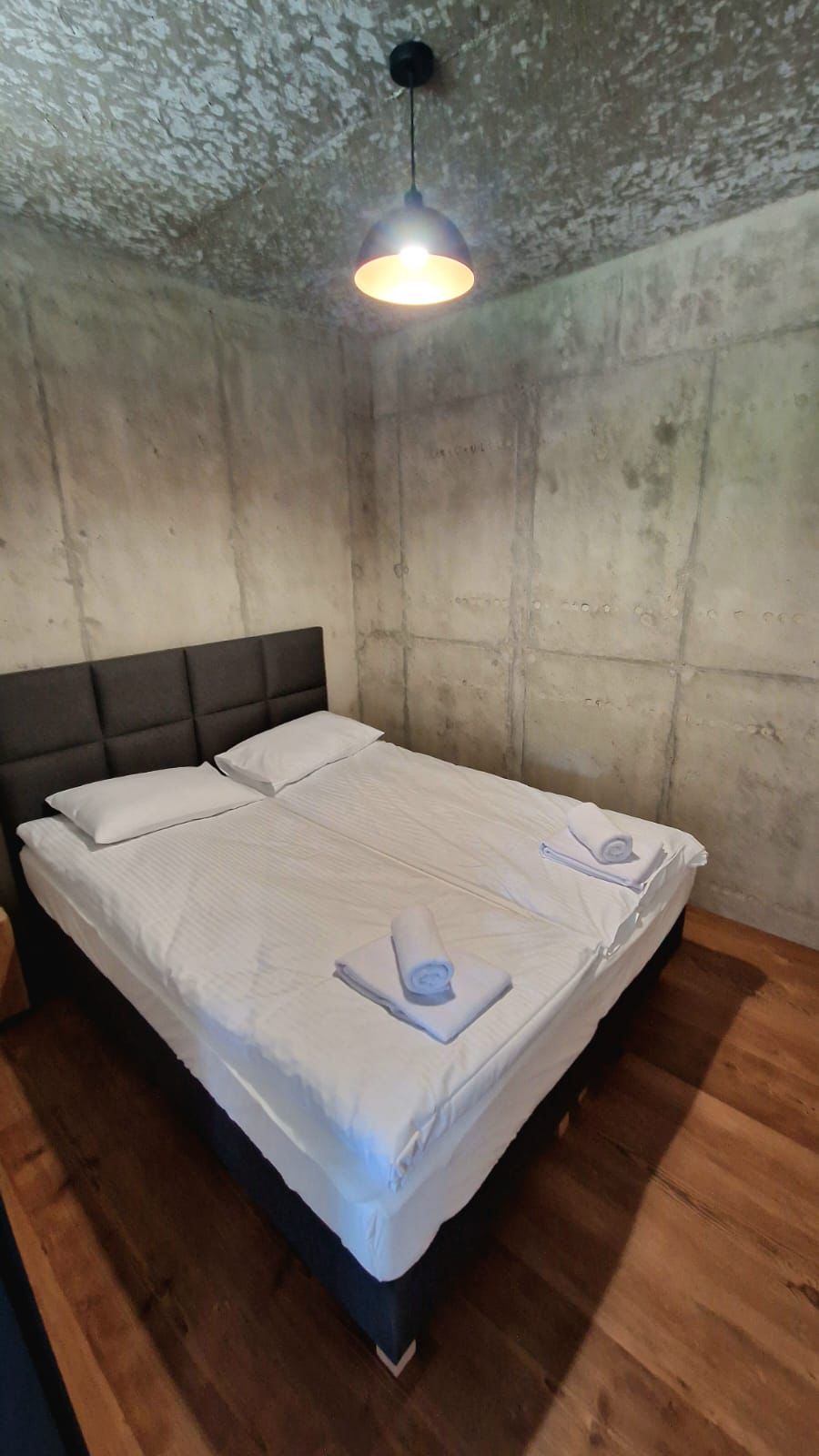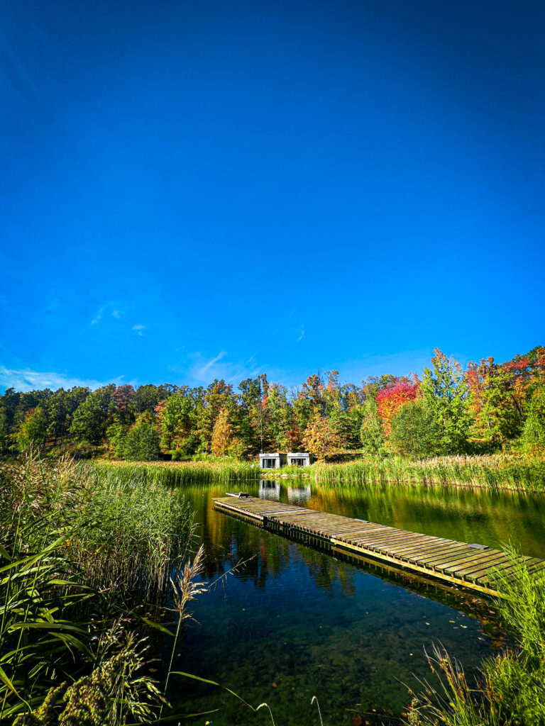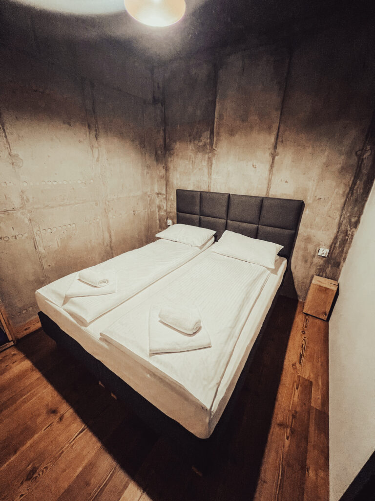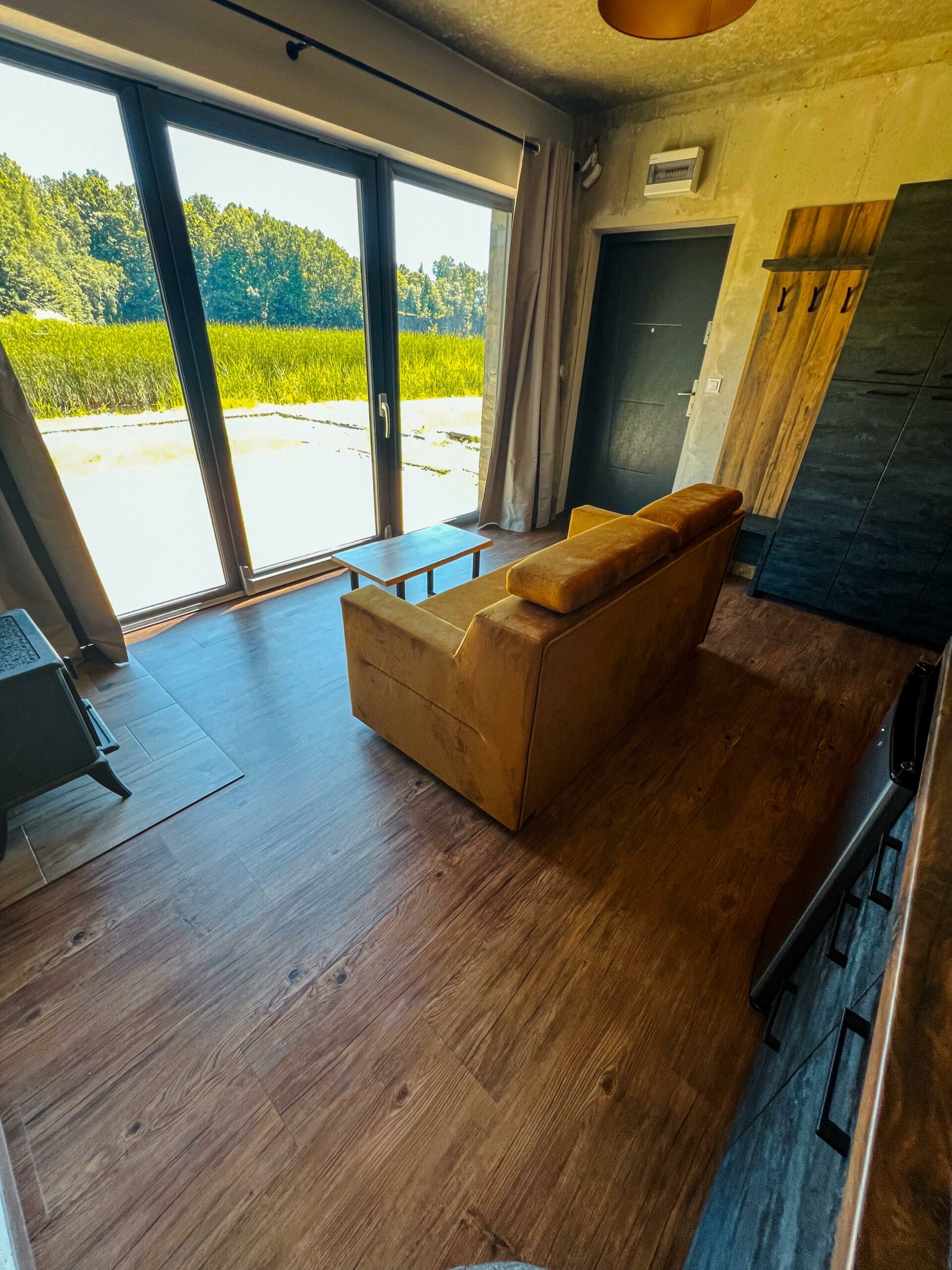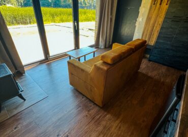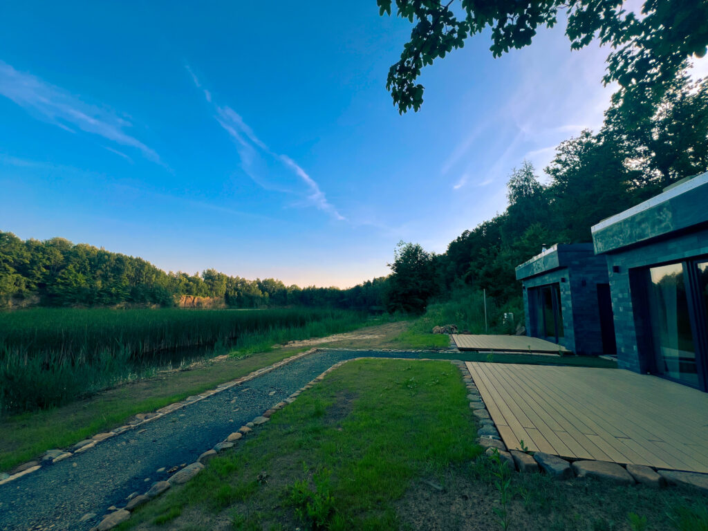 Ten przytulny Domek Podziemny Wschodni położony jest lekko na uboczu, nieco poniżej głównej części ośrodka, tuż przy brzegu naszego jeziora. Jego wyjątkowość polega na tym, że jest wbudowany w skarpę i otoczony z trzech stron betonową konstrukcją, dzięki czemu zyskuje więcej intymności i oferuje niezakłócony widok na wodę. Przestronne przeszklenia od strony jeziora pozwalają podziwiać poruszający widok – szczególnie o wschodzie słońca, gdy tafla jeziora delikatnie odbija pierwsze promienie dnia. Tuż przed domkiem znajduje się pływający pomost, z którego można wyruszyć kajakiem na jezioro lub dopłynąć do innych zakątków ośrodka, a także po prostu usiąść z poranną kawą, wypić shake’a i spokojnie rozpocząć dzień w rytmie natury.