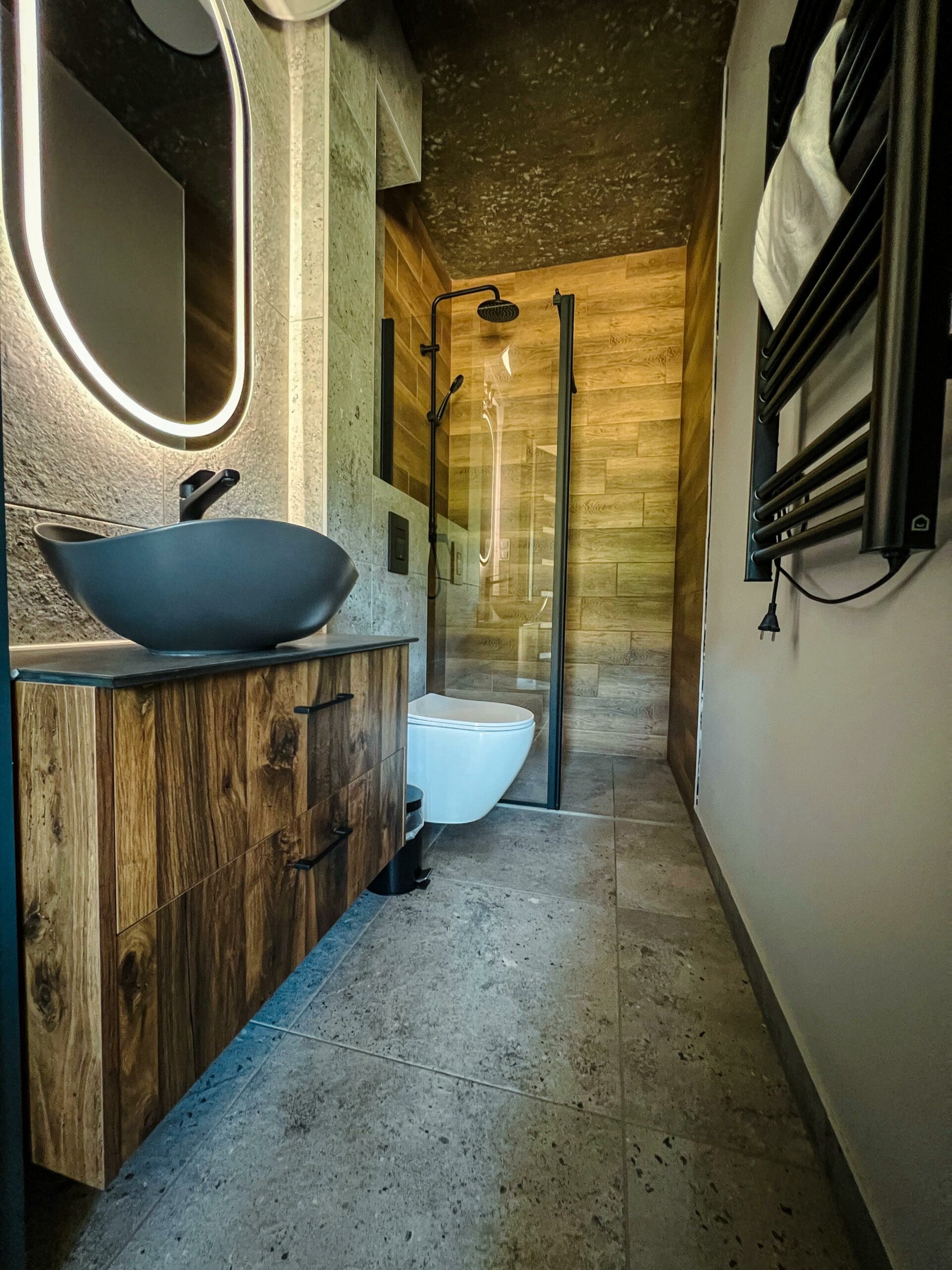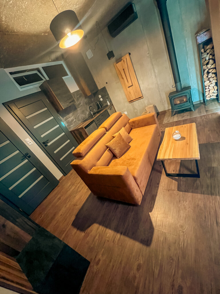 Wnętrze domku łączy prostotę z funkcjonalnością. Znajdziesz tu wszystko, czego potrzeba do komfortowego pobytu – idealnego zarówno na romantyczny weekend, jak i samotny reset z dala od zgiełku.