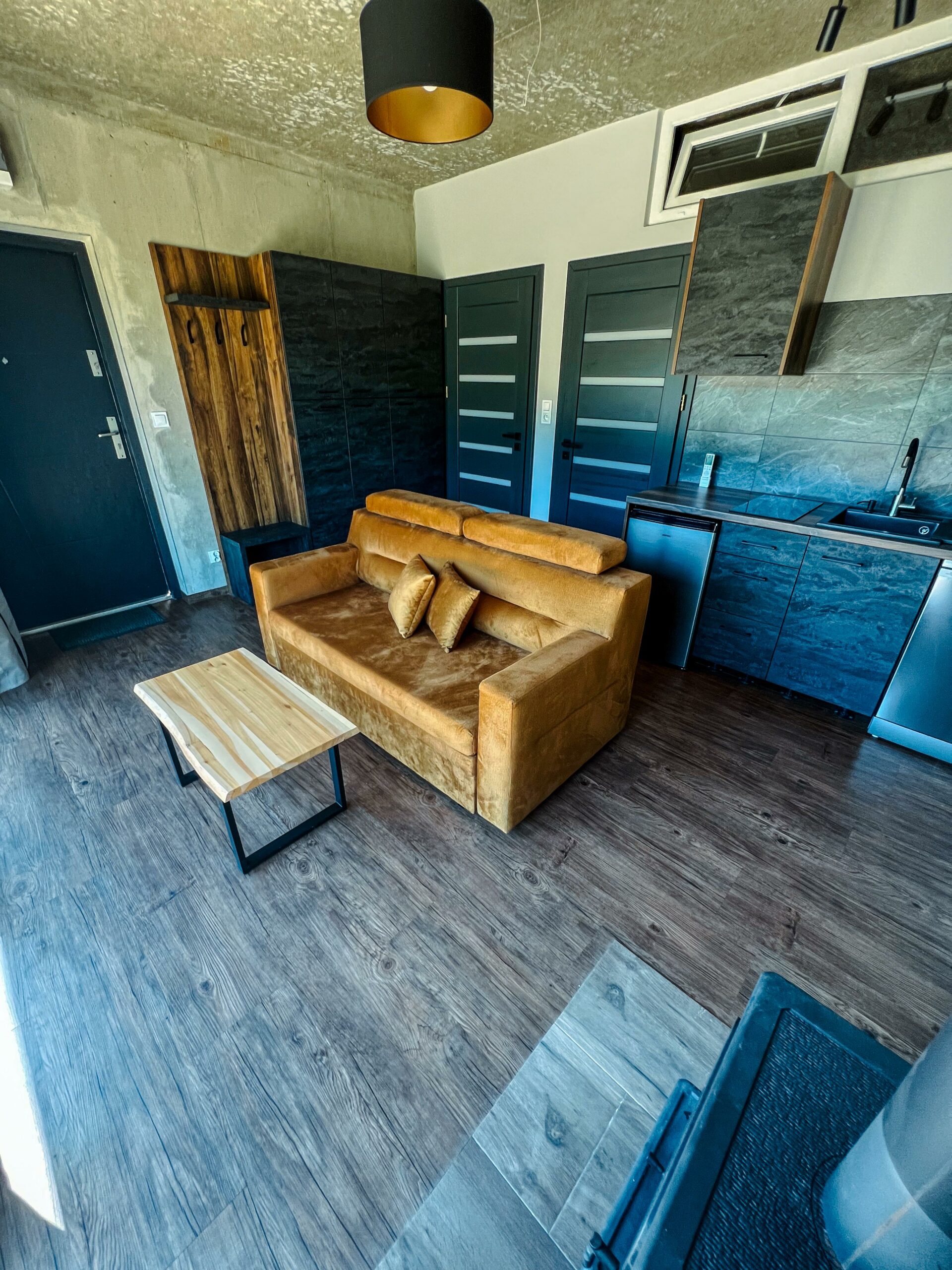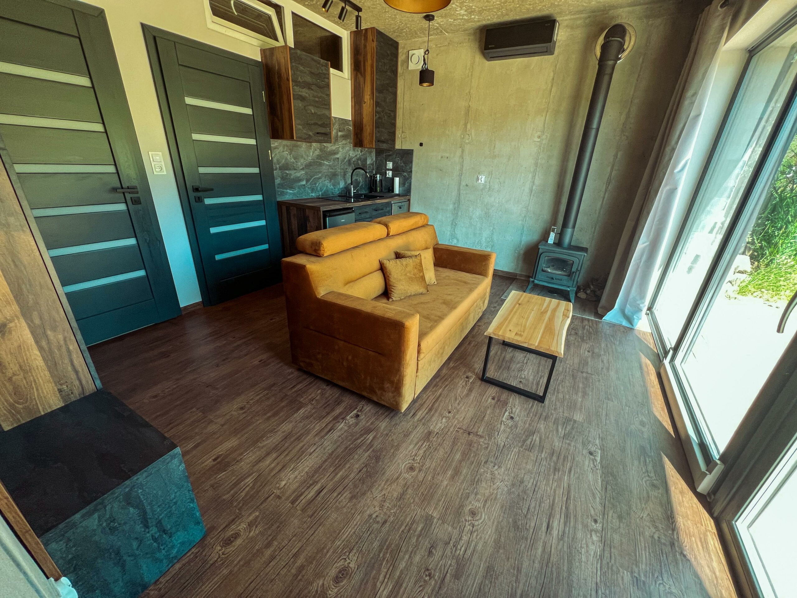 Domek urządzony jest w stylu industrialnym, gdzie pierwsze skrzypce grają surowy beton i naturalne drewno – prosto, nowocześnie i przytulnie zarazem.