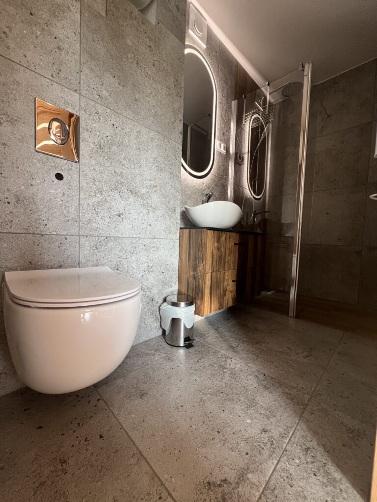 Domek posiada standardowy, w pełni wyposażony aneks kuchenny, łazienkę oraz salon z rozkładaną, dwuosobową kanapą. Na górnej kondygnacji znajdują się dwie sypialnie z łóżkami, które można ustawić jako podwójne (queen size) lub rozdzielone (twin). Prosimy o informację przy rezerwacji, jaki układ Państwo wybierają – pozwoli to przygotować dla Państwa najbardziej komfortowe warunki pobytu.