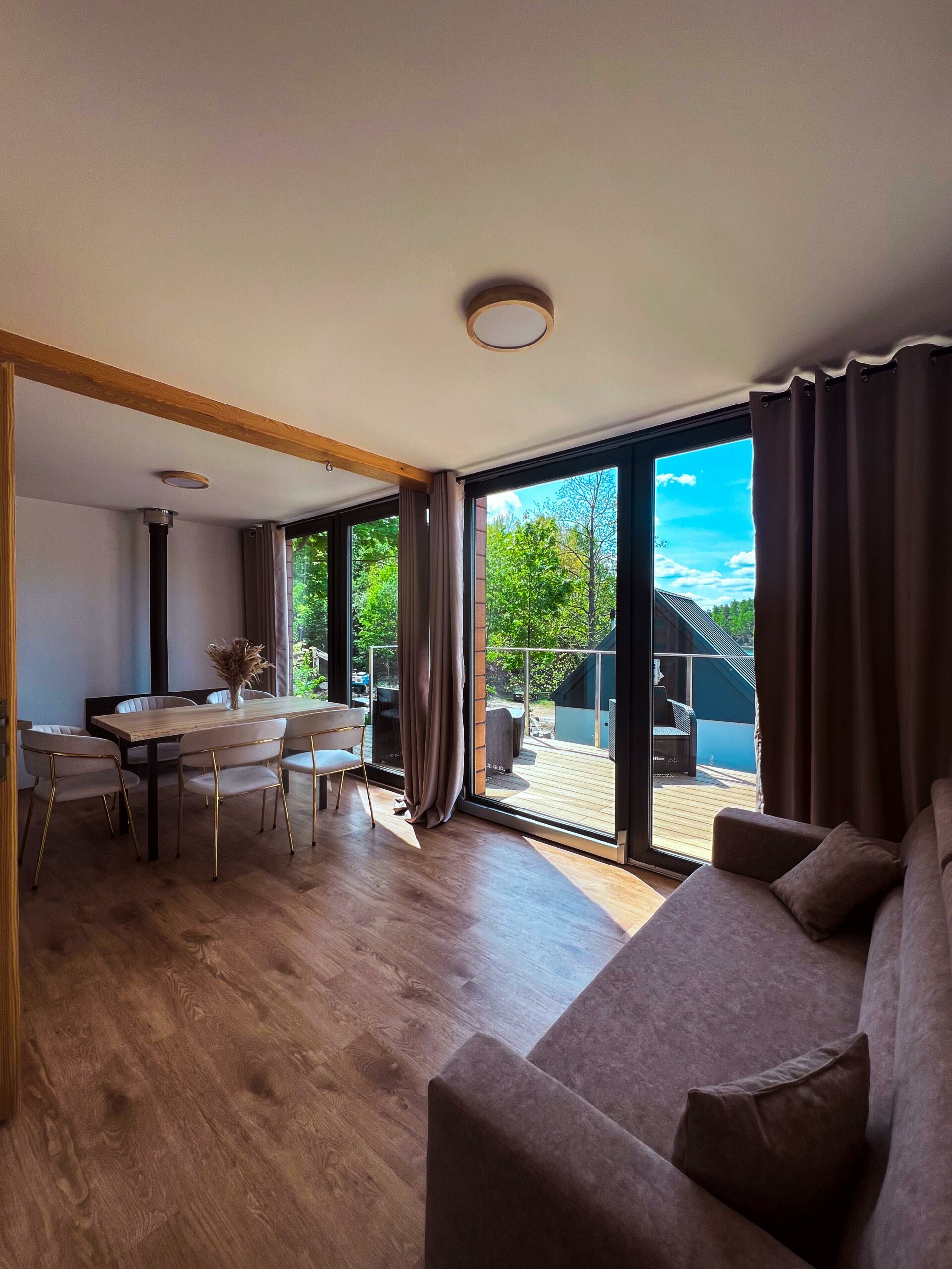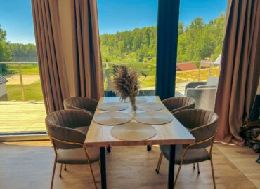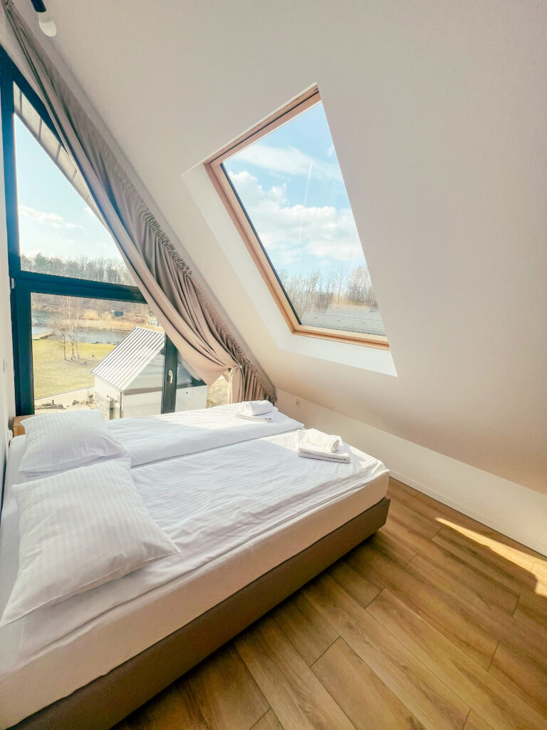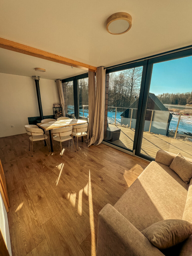 Domek Śnieżny to jeden z wyżej położonych domków w naszym ośrodku – stoi na skarpie, z której rozciąga się panoramiczny widok na jezioro i otaczającą naturę. To wyjątkowa przestrzeń, zaprojektowana z myślą o tych, którzy lubią więcej swobody.