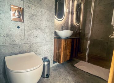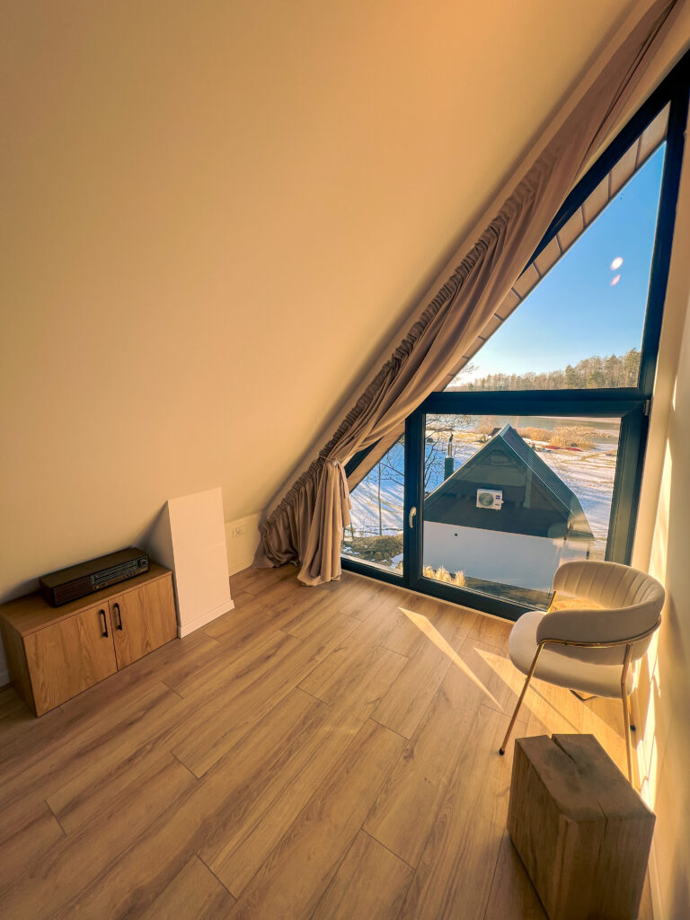 W domku znajdują się dwie osobne sypialnie dwuosobowe. W jednej z nich czeka na Was duże okno dachowe, przez które nocą można obserwować niebo pełne gwiazd. A że jesteśmy w górach – do gwiazd jest jakby bliżej. Bez problemu dostrzeżecie Wielki Wóz, Drogę Mleczną, a przy pełni księżyca… no cóż, może i całą galaktykę – kto wie?