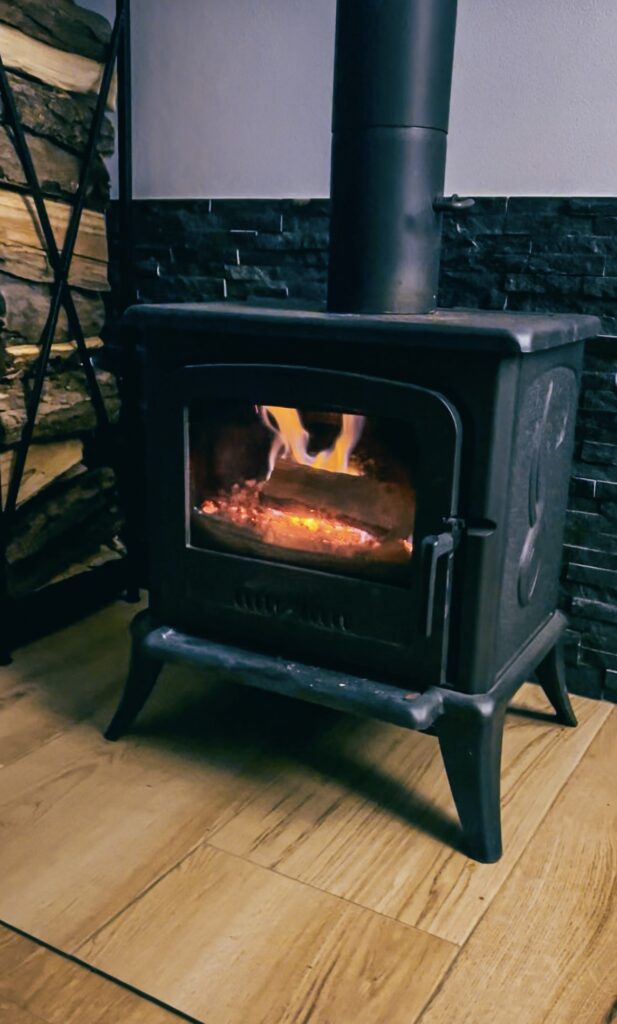 W centrum salonu znajduje się mały kominek, który właśnie zimą pokazuje pełnię swojego uroku. Co prawda, kominki są we wszystkich naszych domkach, ale to właśnie tutaj, dzięki większej przestrzeni, ogień rozświetlający wnętrze nabiera wyjątkowego klimatu – idealnego na wieczory z książką, winem albo planszówką.