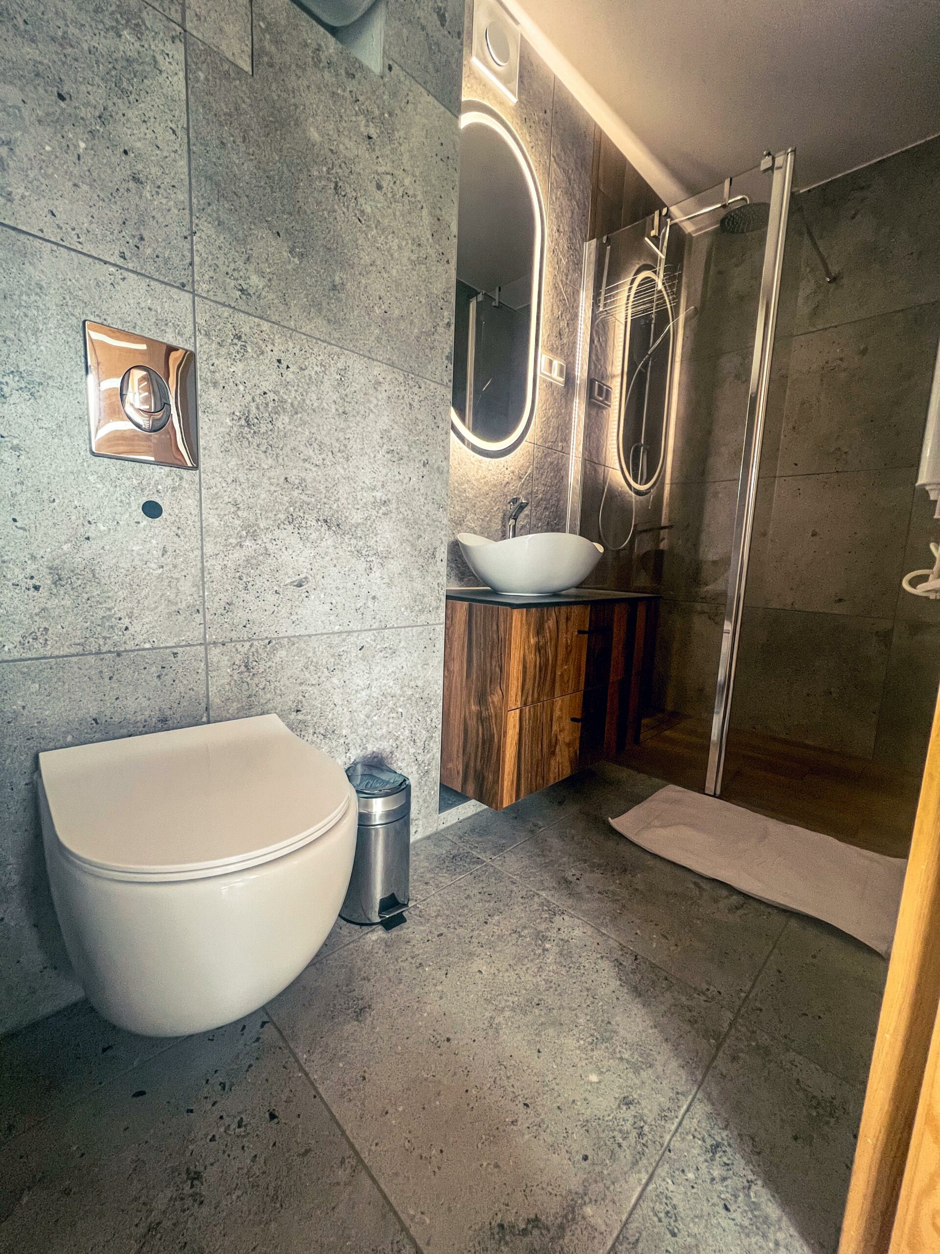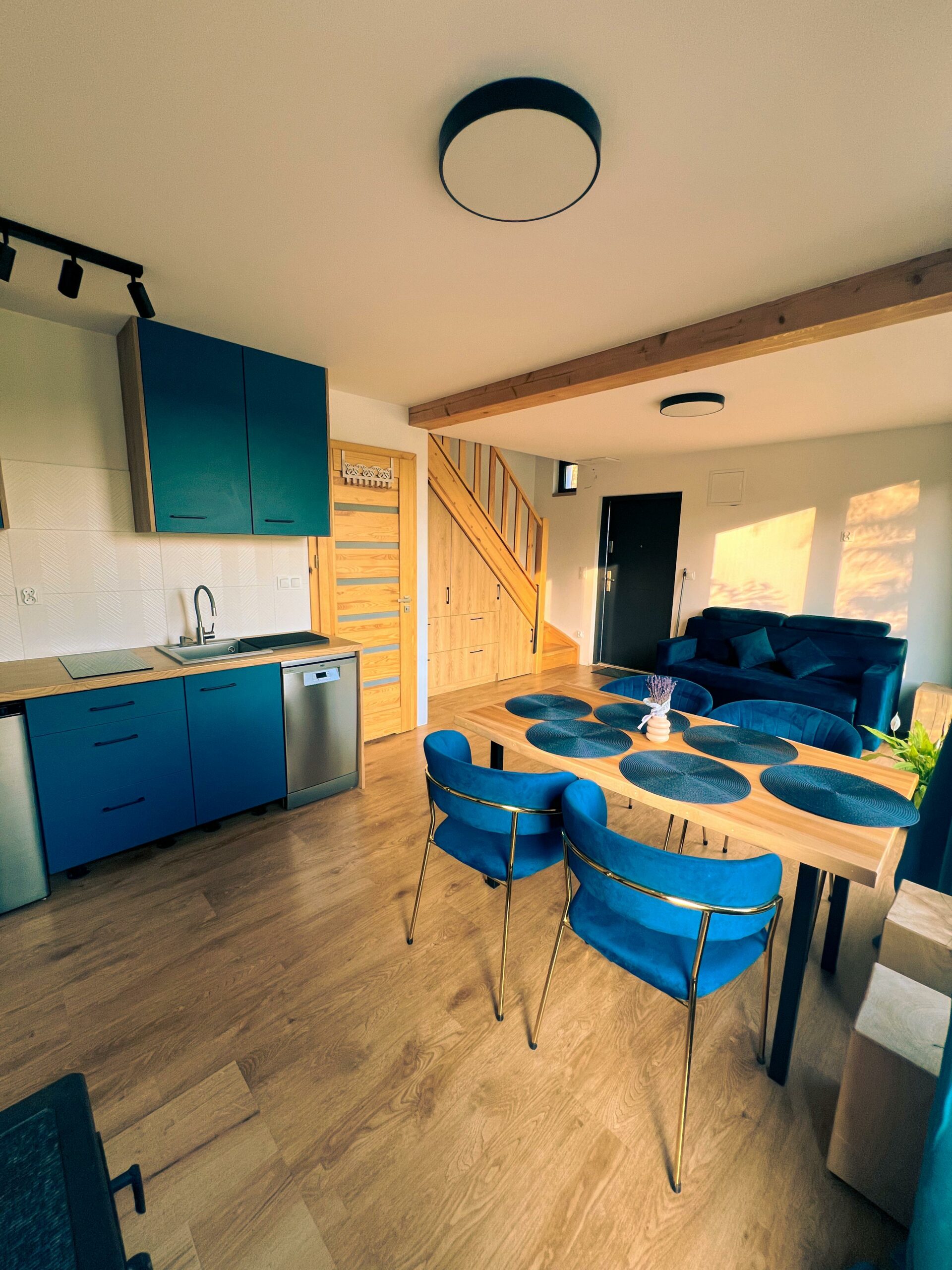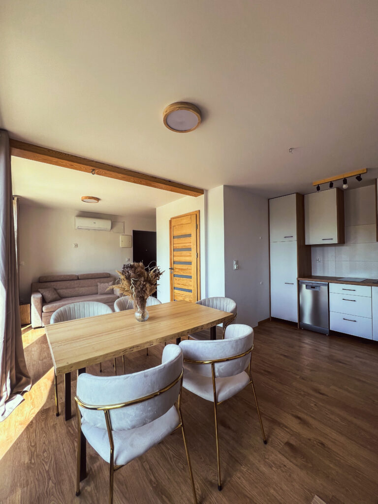 Jako jedyny spośród naszych domków, Śnieżny ma inny układ dolnej kondygnacji – część dzienna, czyli salon z kuchnią, jest tutaj przestronniejsza niż w pozostałych domkach. Dzięki temu jest to idealna opcja dla większych ekip, rodzin z dziećmi albo osób, które lubią wspólnie spędzać czas w komfortowym wnętrzu.
